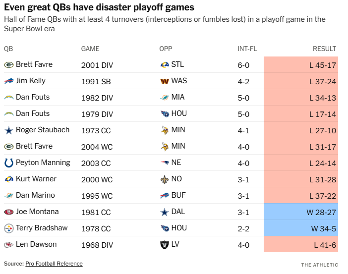 While Stroud is now walking the path of redemption, well, who isn't among the NFL's young quarterbacks these days? Sam Darnold walked it to a Super Bowl. I think Maye is (rightfully) ahead of Stroud in the young quarterback pecking order and also has a lot to atone for from his playoff performance. So does Herbert. (Again.) Caleb Williams' highs are so incredibly high, and also he was wildly inconsistent in the playoffs. Josh Allen got his head coach fired with his own four-turnover playoff game. Trevor Lawrence threw away his playoff game. Jordan Love watched the Packers defense get Williamsed and couldn't rally. The only young quarterback who didn't fumble away the playoffs is Bo Nix, and the only reason he didn't is that he got hurt instead. There were no real games this season that ended where the story was "ah, the third-year quarterback just crushed it but his defense couldn't hold up." The defense was the reason these teams were where they were.