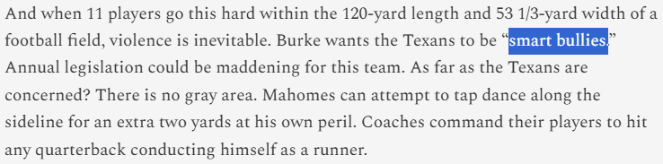 I guess where I'm at is: I think the Texans offense has a real way to be an smart bully. If they can bully a team on the ground (they often can't), by all means, feel free to do that. If you're getting played like the Chargers played the Texans in Week 17? Sure, you must pound that rock.